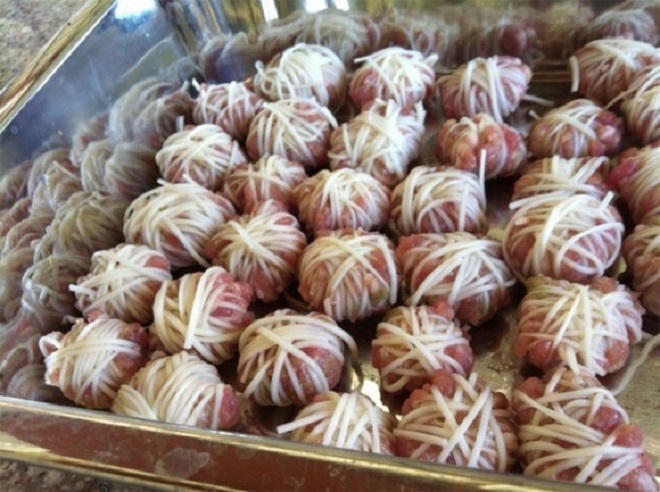 Cuộn những sợi mì ống xung quanh viên thịt xay đã chuẩn bị ở trước