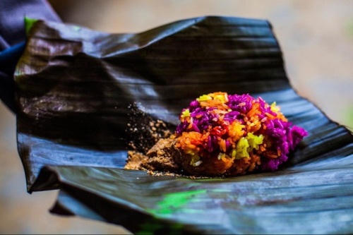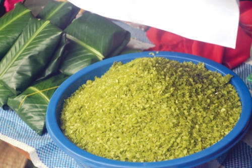 Lúa nếp ở Tú Lệ chín theo mùa, hạt nào hạt ấy vừa dài vừa mẩy, được xếp vào một trong những loại nếp ngon nhất nước ta. Thứ gạo ấy trộn cùng các loại lá cây rừng, đồ lên thành xôi ngũ sắc có vị thơm ngọt và dẻo đến kỳ lạ. Dẻo mà lại rời từng hạt nếp chứ không dính chặt lấy nhau như đa phần các loại nếp thường khác. Người ta nói rằng, nhờ nguồn nước từ con suối trên đỉnh Khau Phạ mà hạt xôi chín căng bóng, nhai kỹ chỉ thấy béo bùi mà không ngán. Xôi nếp nương Tú Lệ bán nhiều trong các chợ phiên Mù Cang Chải, chấm với muối lạc hoặc ăn nóng cùng thịt lợn rừng nướng thơm phức, khiến cái se lạnh vùng cao cũng giảm bớt đi phần nào. Ảnh: Hữu Duyên.