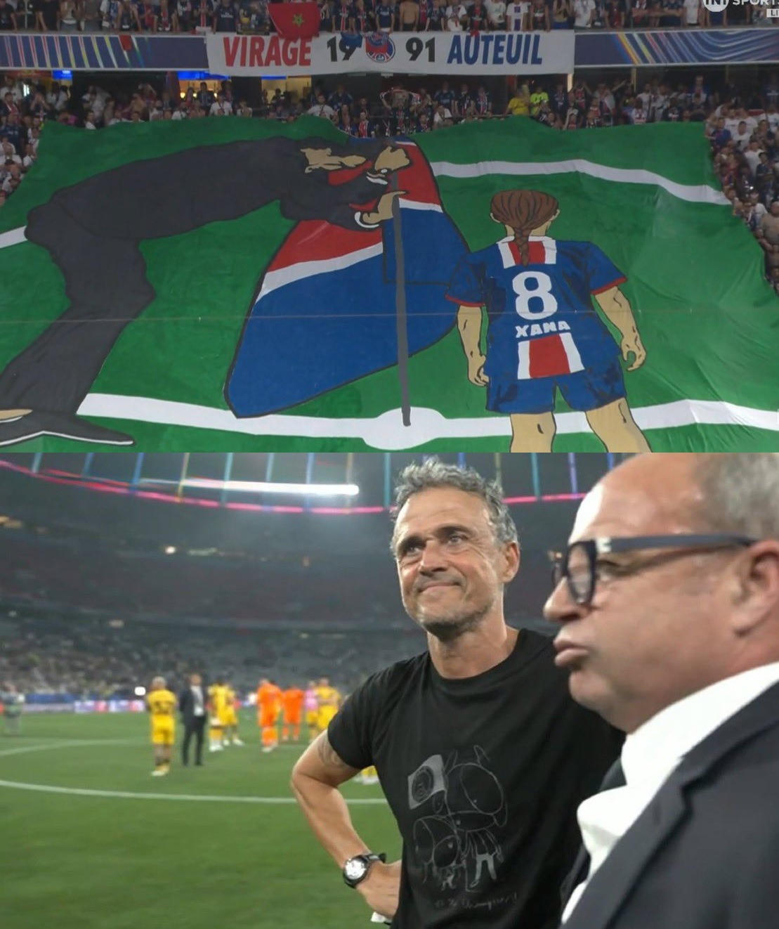 Trong trận đấu rạng sáng nay với Inter, người hâm mộ PSG tạo ra một tifo cỡ lớn, in hình ảnh Luis Enrique và Xana đang cắm lá cờ PSG, giống hệt hình ảnh ông và con gái cách đây 10 năm.