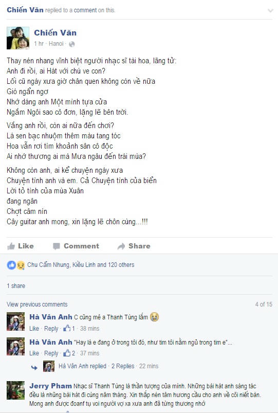 Facebooker Chiến Văn còn viết những dòng thơ thay nén nhang vĩnh biệt người nhạc sĩ tài hoa, lãng tử: