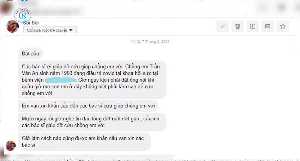 Trước đó, 14h12 ngày 7/8/2021, fanpage BV Chợ Rẫy nhận được tin nhắn cầu cứu từ một phụ nữ trẻ tuổi. Chị viết: "Các bác sĩ ơi hãy cứu giúp chồng em với! Chồng em đang điều trị COVID-19, giờ nguy kịch phải đặt ống nội khí quản, nguy cơ tử vong… Giờ hai mẹ con em ở đây không biết phải làm sao để cứu chồng em! Mười ngày rồi giờ nghe tin mà đứt ruột đứt gan. Em van xin khẩn cầu các bác sĩ cứu giúp chồng em với…".