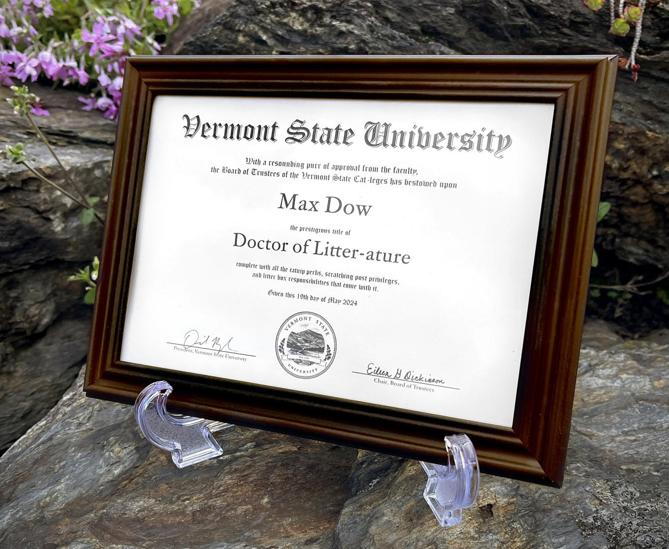 Không chỉ là một chú mèo thân thiện, Max Dow còn là "chiến binh" diệt chuột tài ba và là "bậc thầy" ngủ trưa. Để ghi nhận những đóng góp đặc biệt của chú mèo này, hội đồng quản trị Đại học bang Vermont đã quyết định trao tặng Max bằng tiến sĩ danh dự "litter-ature", kèm theo "đặc quyền" sử dụng cỏ bạc hà, trụ cào móng và khay vệ sinh miễn phí.