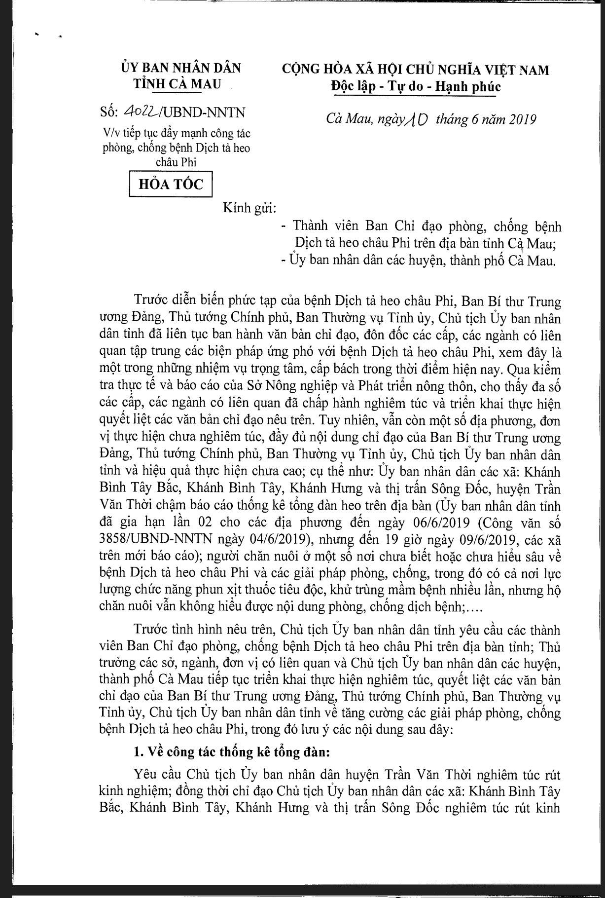 Cụ thể như UBND các xã: Khánh Bình Tây Bắc, Khánh Bình Tây, Khánh Hưng và thị trấn Sông Đốc (huyện Trần Văn Thời) chậm báo cáo thống kê tổng đàn heo trên địa bàn (UBND tỉnh đã gia hạn lần 2 cho các địa phương đến ngày 6/6/2019 nhưng đến 19h ngày 9/6/2019, các xã trên mới báo cáo).