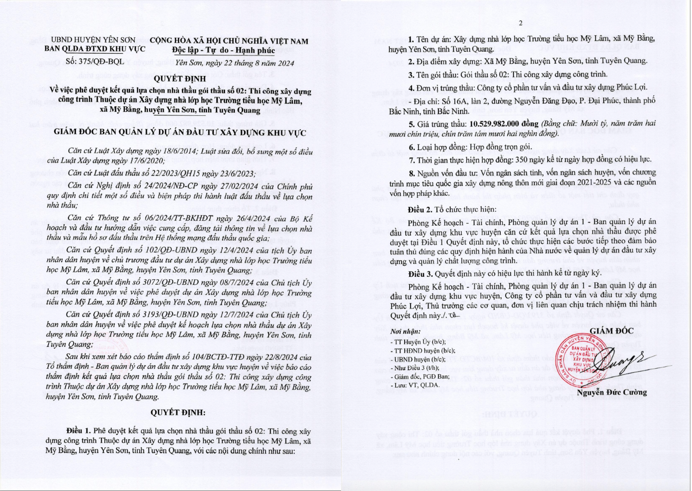 Như, ngày 28/11/2024, Giám đốc Ban Quản lý dự án đầu tư xây dựng khu vực thành phố Tuyên Quang ký quyết định phê duyệt lựa chọn Công ty cổ phần tư vấn và đầu tư xây dựng Phúc Lợi trúng gói thầu số 01 - Thi công xây dựng và lắp đặt thiết bị công trình thuộc dự án: Nhà lớp học Trường THCS Lưỡng Vượng, xã Lưỡng Vượng, thành phố Tuyên Quang. Giá trúng thầu 10.950.000.000 VND, giá gói thầu 11.212.499.000 VND (tiết kiệm 2,4%).