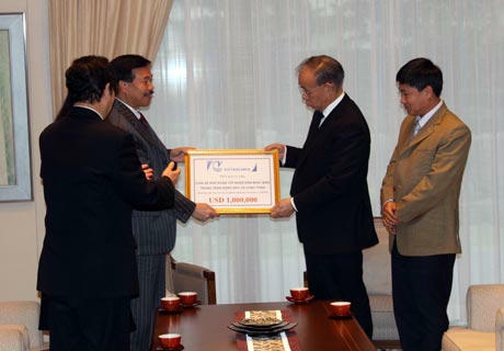 | Ông Võ Nhật Thăng, Chủ tịch Hội đồng quản trị, Tổng giám đốc Vietracimex trao số tiền 1 triệu USD cho Đại sứ Nhật Bản Tanizaki Yasuaki |