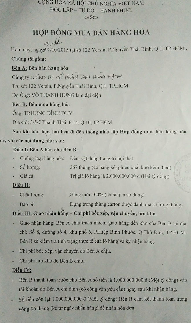 Theo tài liệu và lời kể của bà Hạnh, từ môi giới của người quen biết, ngày 10/10/2015, Công ty CP Vạn Hùng Hạnh (của gia đình bà Hạnh) ký hợp đồng mua bán với ông Duy một lô hàng đèn, vật dụng trang trí nội thất gồm 267 thùng có bảng kê, phiếu xuất kho và còn nguyên đai, nguyên kiện. Lô hàng trên trị giá 2 tỷ đồng. Công ty của bà Hạnh là bên bán.
