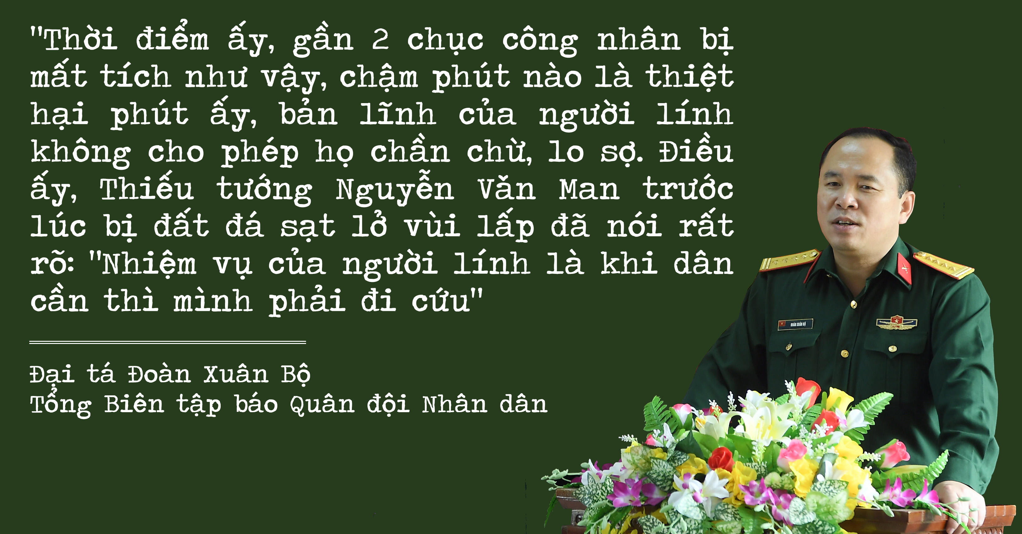 Tham gia cứu hộ, cứu nạn mà hy sinh nhiều đến thế thì ai dám đi? Giải đáp băn khoăn này, Đại tá Đoàn Xuân Bộ cho rằng, đó là rủi ro, mà đã là rủi ro thì không ai mong muốn và cũng không thể biết trước để mà tránh. “Thời điểm ấy, gần 2 chục công nhân bị mất tích như vậy, chậm phút nào là thiệt hại phút ấy, bản lĩnh của người lính không cho phép họ chần chừ, lo sợ. Điều ấy, Thiếu tướng Nguyễn Văn Man trước lúc bị đất đá sạt lở vùi lấp đã nói rất rõ: “Nhiệm vụ của người lính là khi dân cần thì mình phải đi cứu”.