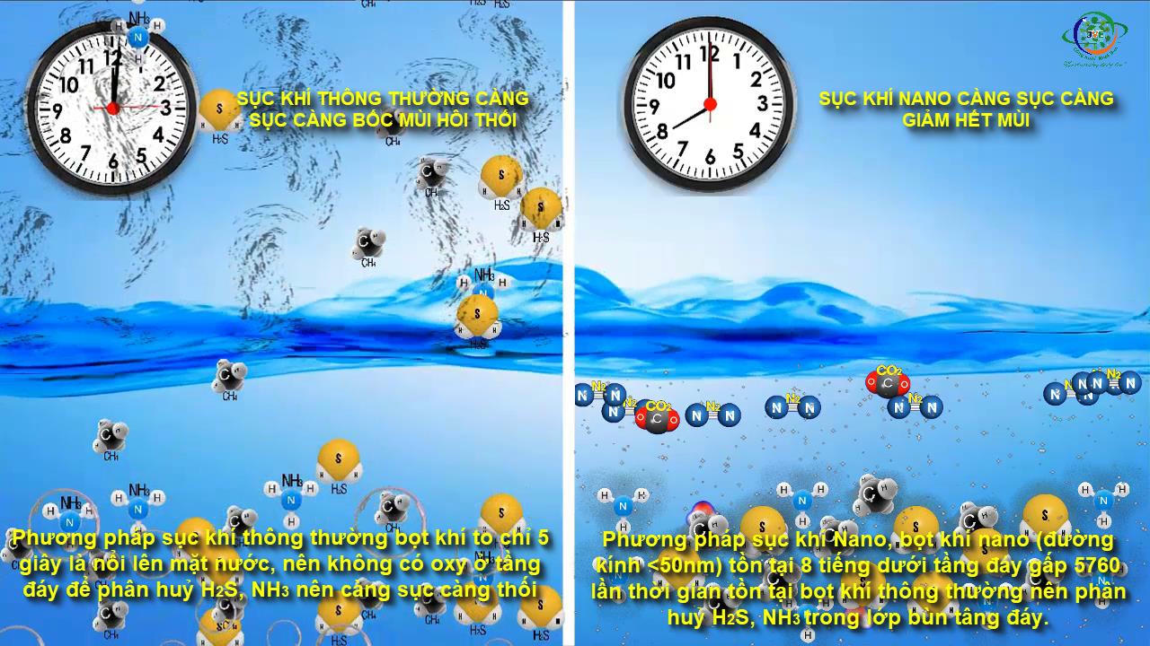 Sục khí nano tạo ra bọt khí siêu nhỏ kích thước nano (đường kính <50nm), tồn tại tối thiểu 8 tiếng (tức thời gian tồn tại lâu gấp 5760 lần so với bọt khí thông thường) trong tầng bùn đáy và phân hủy các khí độc như H2S, NH3, CH4 tức thì do vậy hiệu quả xử lý mùi rất nhanh chỉ trong một vài ngày và càng sục càng hết mùi hôi thối.