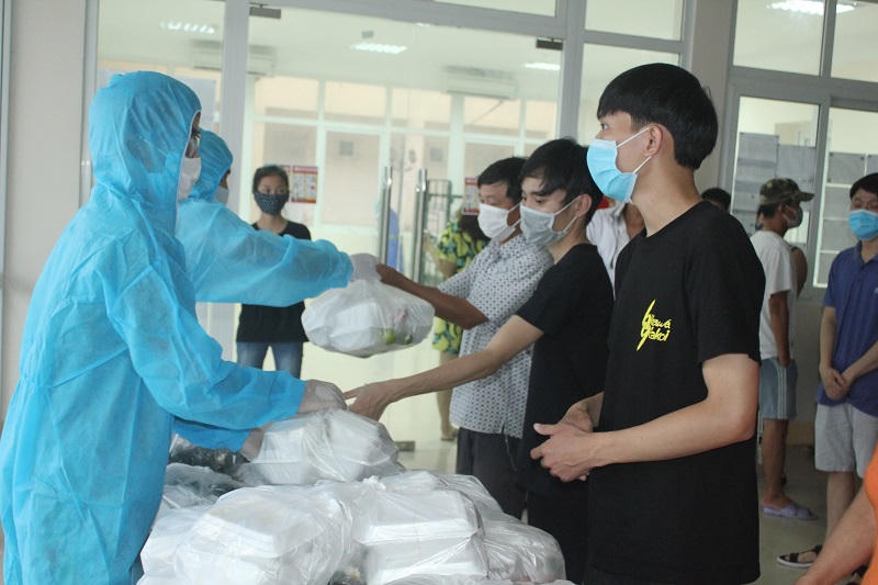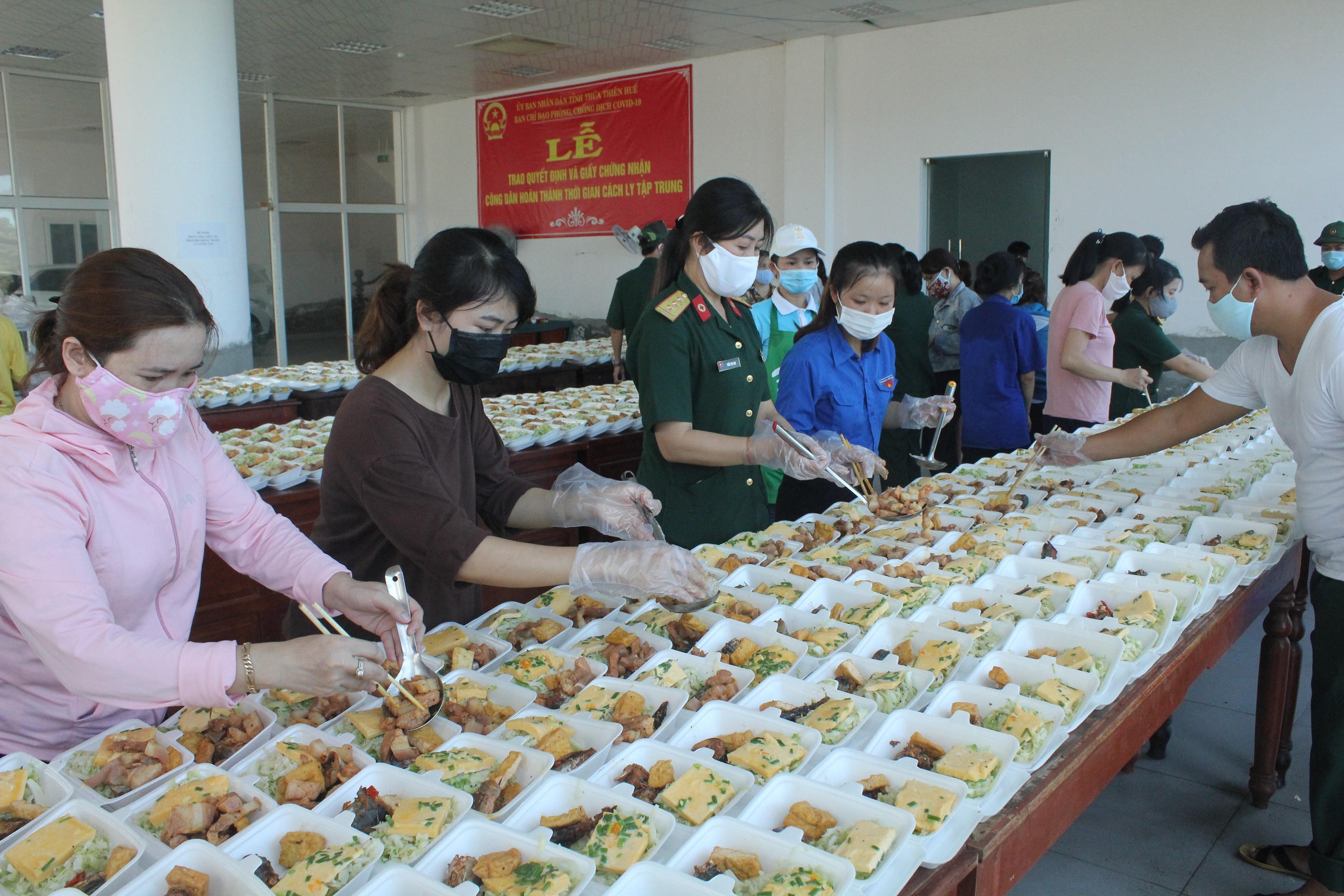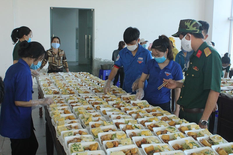 Khi các suất ăn được đóng gói, phân phát cẩn thận bởi những chiến sĩ mặc đồ bảo hộ vừa xong cũng là lúc Hội phụ nữ Bộ chỉ huy quân sự tỉnh, các đoàn viên, Hội phụ nữ huyện Phú Vang, tỉnh Thừa Thiên – Huế đến gian bếp, tiếp sức cùng các cán bộ, chiến sĩ hoàn thành 2 bữa ăn chính trong ngày. Nhiều chị bỏ công việc đồng áng, buôn bán, xắn tay áo nhặt rau, thái thịt chế biến phục vụ bà con.