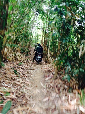 Đến bìa rừng, những chiếc xe máy bắt đầu đi chầm chậm. Con đường đất đỏ lùi lại phía sau để nhường cho con đường mòn với những lá cây dày cộm dưới chân. Gọi là đường, nhưng thực chất nó là một lối đi xuyên trong rừng, lâu dần mòn rồi thành con đường độc đạo.