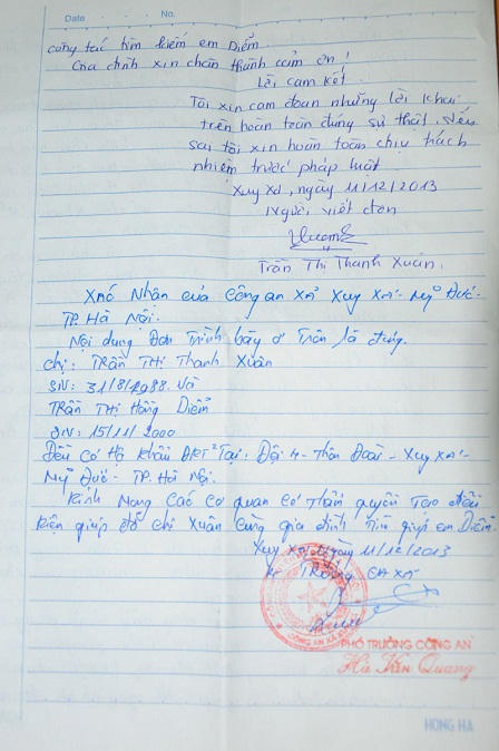 | Lá đơn trình báo của gia đình đến CA xã nơi Diễm cư trú. |