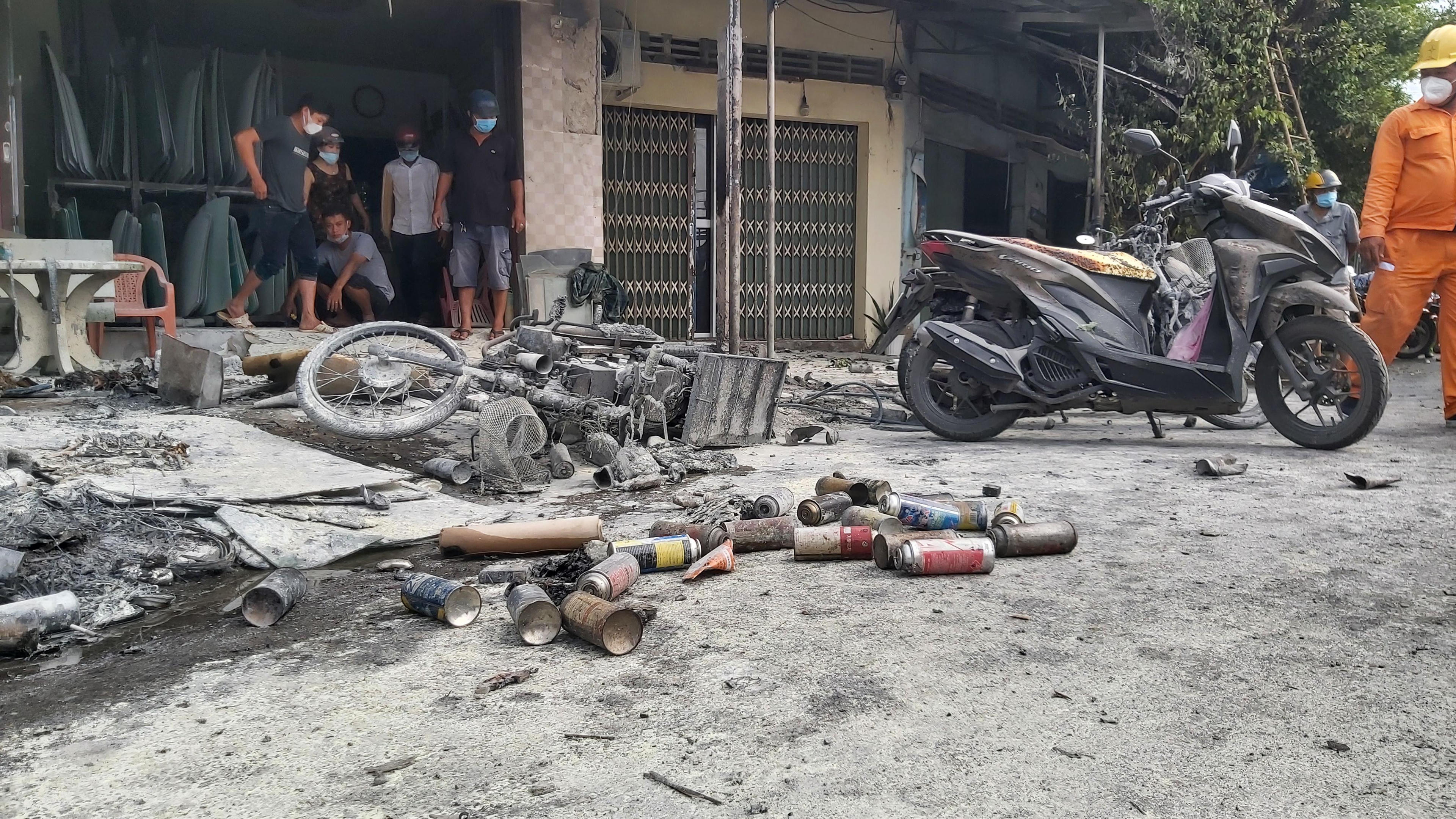 | Xe máy bị cháy rụi, nhiều bình gas mini nổ văng nhiều nơi |