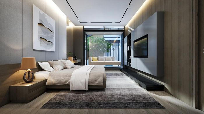 Gia chủ nên thiết kế đèn cách đầu giường một chút với ánh sáng vàng nhẹ nhàng. |