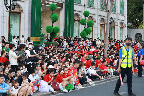 Người dân TP HCM xếp hàng từ sớm để xem buổi hợp luyện của các chiến sĩ. |