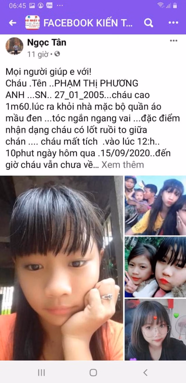 Trước đó, vào ngày 16/9, tài khoản Facebook cá nhân có tên Ngọc Tân đã đăng tải bài viết trên hội nhóm Kiến Thụy với nội dung, cháu gái tài khoản này là Phạm Thị Phương Anh (SN 2005, HKTT tại thôn Đại Lộc, xã Đại Hợp, huyện Kiến Thụy) đã rời nhà từ trưa 15/9 đến nay vẫn chưa về và mong muốn cộng đồng mạng hỗ trợ tìm kiếm.