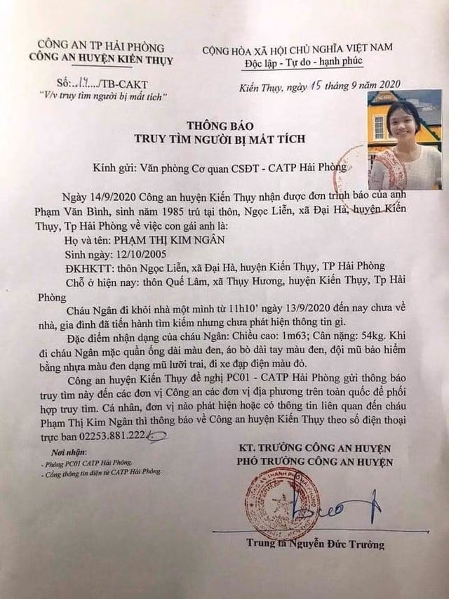 Gia đình đã trình báo cơ quan Công an. Ngày 15/9, Công an huyện Kiến Thụy phát thông báo tìm cháu Phạm Thị Kim Ngân.