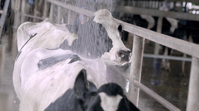 Bên trong Resort Bò Sữa là khu vực chuồng bò được trang bị hệ thống làm mát tự động thông qua các cảm biến về khí hậu trong và ngoài để đảm bảo môi trường bên trong chuồng trại luôn mát mẻ và thoải mái. Toàn bộ hệ thống này được lập trình và vận hành tự động giúp thu được kết quả tối ưu nhất. Nhờ vậy, một môi trường sống mang đặc điểm khí hậu ôn đới đã được thiết lập ngay tại Việt Nam, giúp cho 8000 cô bò được hưởng thụ như chính ở quê hương của mình.