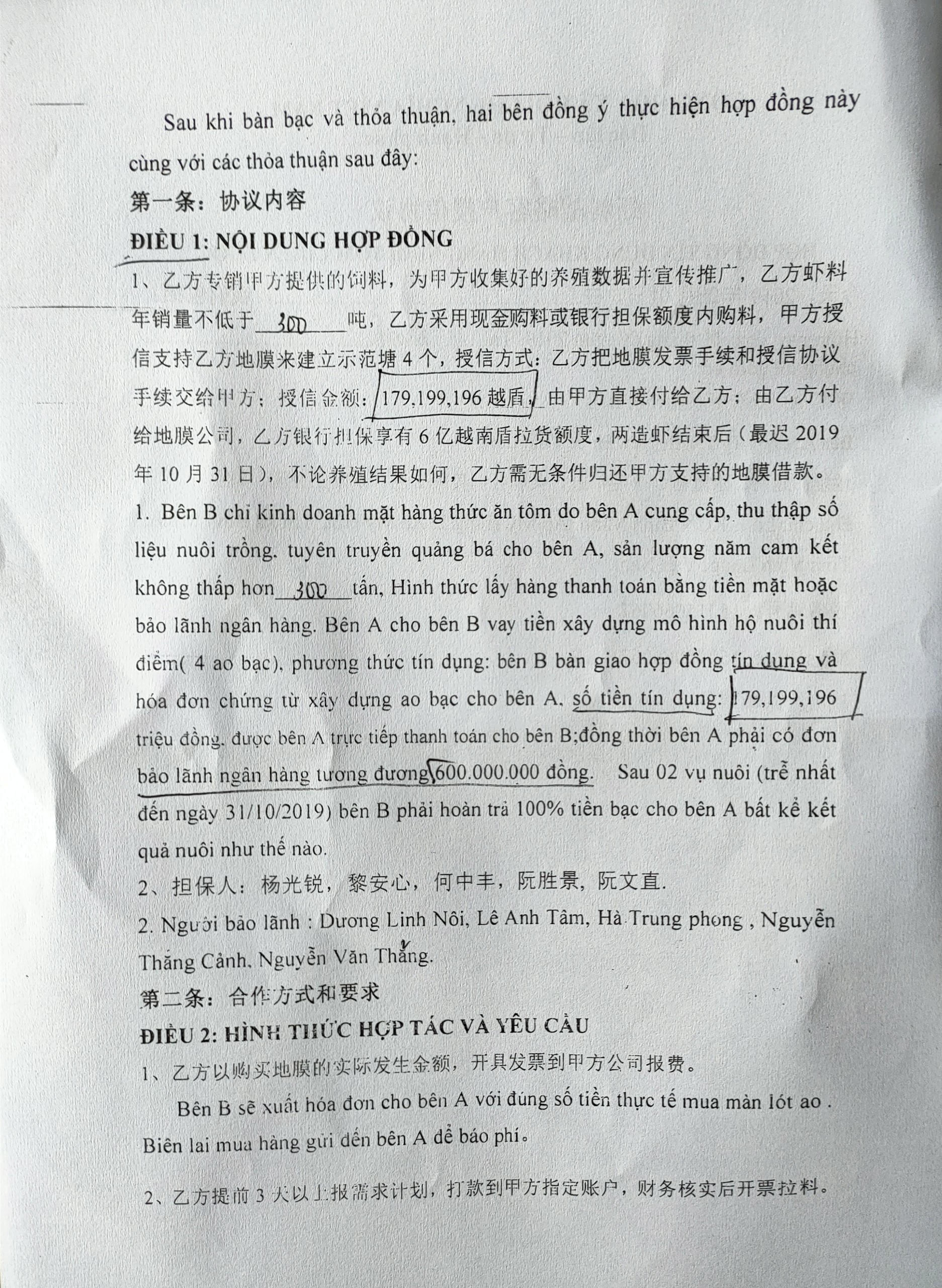 Theo ông Hữu, trong “Hợp đồng tín dụng khách hàng nuôi tôm chiến lược” ngày 1/4/2019 giữa hai bên thể hiện 3 nội dung quan trọng: một là ông Hữu làm đại lý độc quyền cung cấp thức ăn tôm của Cty NewHope; hai là Cty NewHope cho ông Hữu vay tiền xây 4 ao tôm trải bạt trị giá 180 triệu đồng, thỏa thuận đến 31/10/2019 phải thanh toán; ba là Hợp đồng giữa hai bên có sự bảo lãnh của bên thứ ba là Ngân hàng (có chứng thư bảo lãnh kèm theo).