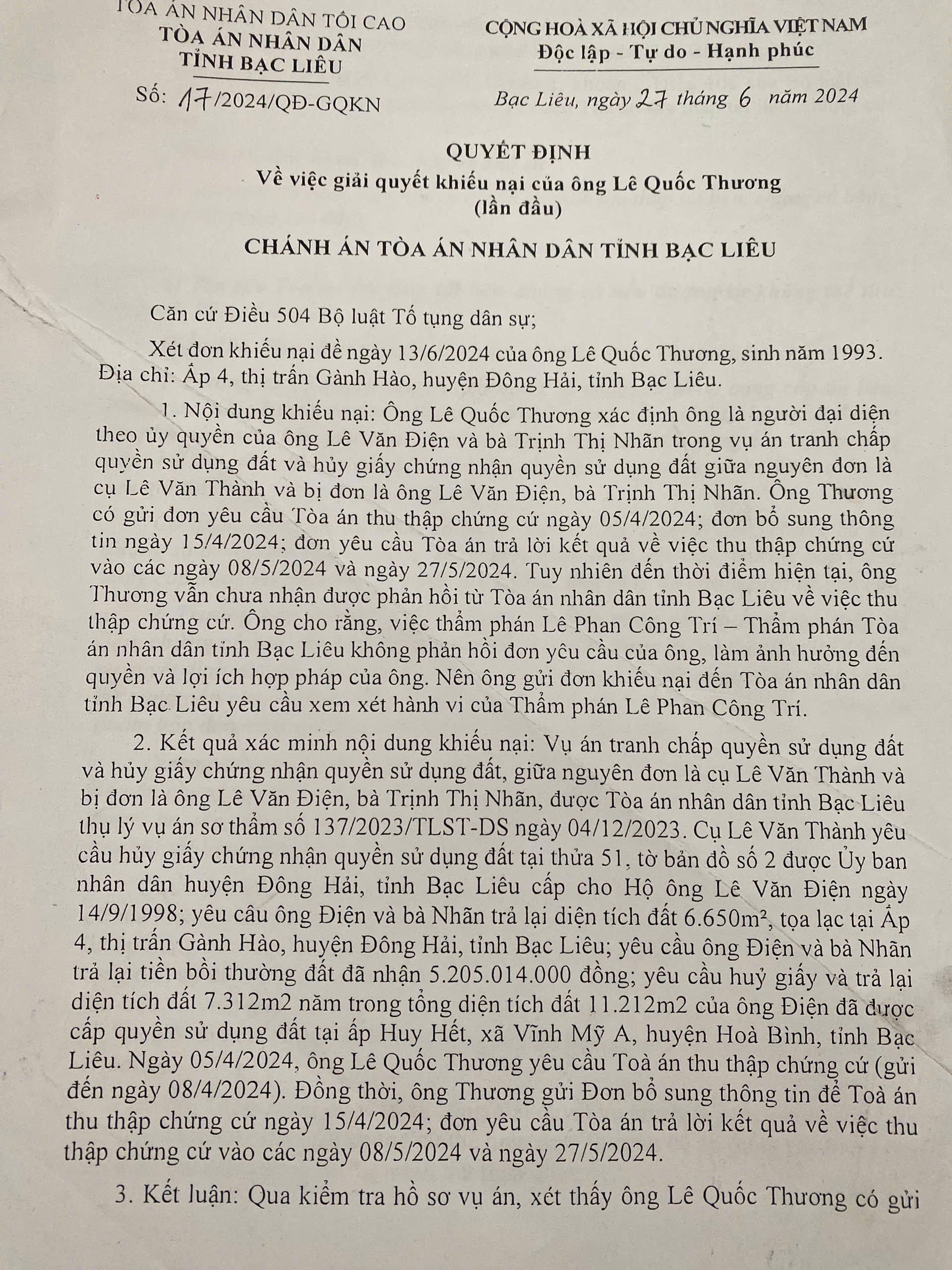 | Quyết định giải quyết khiếu nại của TAND tỉnh Bạc Liêu và TAND cấp cao tại TP HCM. (Ảnh: Đình Thương) |