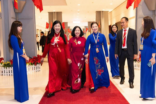 Ủy viên Bộ Chính trị, Bí thư Thành ủy Hà Nội Bùi Thị Minh Hoài (giữa) và các đại biểu đến dự Đại hội. Ảnh: Quang Vinh |