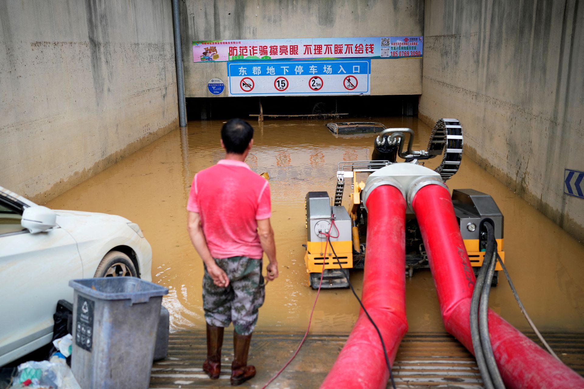 Nước ngập gần chạm trần một hầm đỗ xe ở ở thị trấn Tangxia, Đông Quan, tỉnh Quảng Đông, Trung Quốc. Ảnh: Reuters. |
