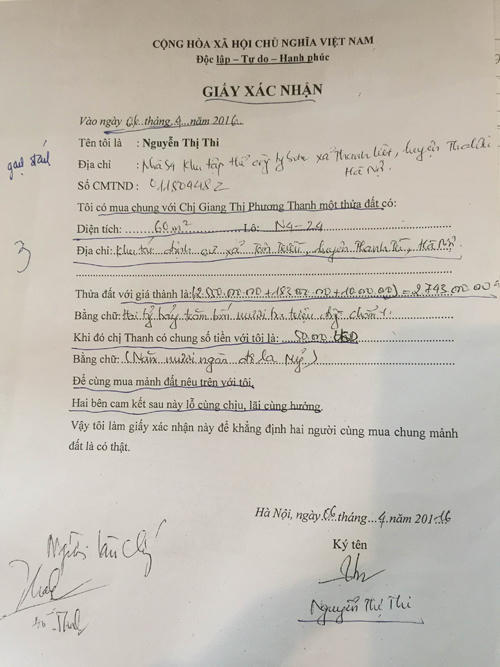 Còn theo Giấy xác nhận vào ngày 6/4/2016 thì bà Nguyễn Thị Thi xác nhận bà Giang Thị Phương Thanh góp 50.000 USD (50.000 đô la Mỹ) với nội dung: “Tôi có mua chung với chị Giang Thị Phương Thanh một thửa đất diện tích 60m2, lô N2-24, khu tái định cư xã Tân Triều, huyện Thanh Trì, TP Hà Nội, Hai bên cam kết lãi cùng hưởng, lỗ cùng chịu”.