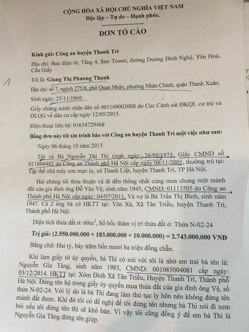 Báo PLVN điện tử nhận được phản ánh của bà Giang Thị Phương Thanh (trú tại số 7, ngách 275/8, phố Quan Nhân, phường Nhân Chính, quận Thanh Xuân, TP Hà Nội) với nội dung: Do mối quan hệ quen biết trong gia đình, ngày 6/10/2015 bà Thanh và bà Nguyễn Thị Thi (trú tại Tập thể Nhà máy sơn mực in, xã Thanh Liệt, huyện Thanh Trì, TP Hà Nội) thống nhất cùng mua chung một mảnh đất của gia đình ông Đỗ Văn Vệ và vợ là bà Trần Thị Bình (trú tại làng Yên Xá, xã Tân Triều, huyện Thanh Trì, TP Hà Nội) có diện tích 60m2, trị giá hơn 2 tỷ 743 triệu đồng.