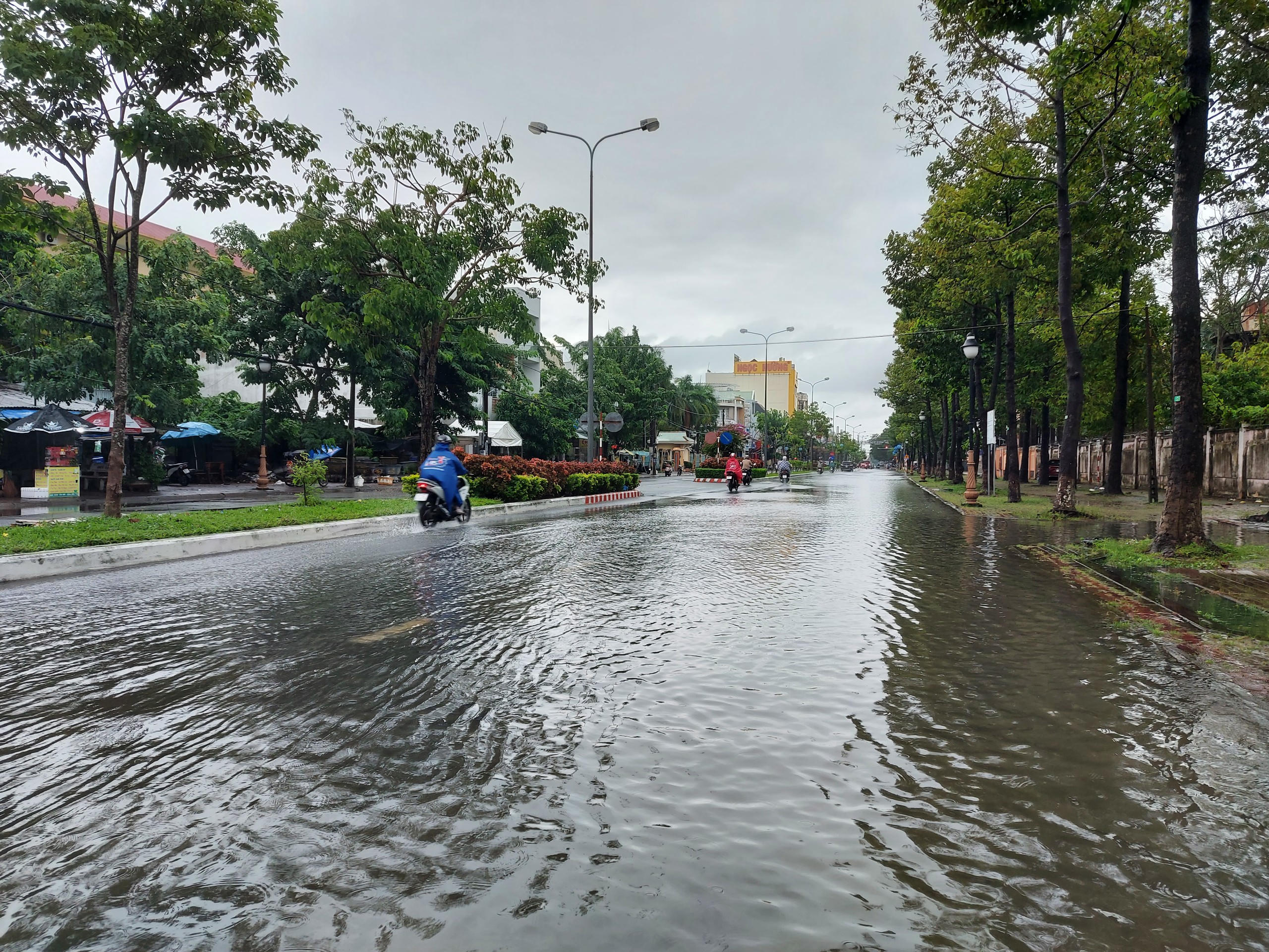 Mưa suốt đêm 28 đến sáng 29/7, các tuyến đường nội ô TP Rạch Giá bị ngập sâu trong nước. |