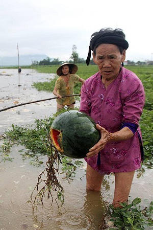 Quần ống cao, ống thấp, chân tay đầy bùn đất, mặt mũi nhễ nhại mồ hôi, bà Hoa hai tay bê quả dưa hấu, khuôn mặt ủ rũ thở dài: “Trời ơi, mất hết rồi, lũ ơi là lũ. Gia đình tui vay ngân hàng 60 triệu để trồng dưa, chưa kịp mừng vì năm nay dưa sẽ được mùa, được giá, ai ngờ lũ đến đúng dịp thu hoạch. Gia đình tui thu hoạch vậy chứ không biết có kịp bán hết không, vì quá nhiều”.