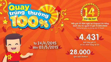 Đặc biệt hấp dẫn là chương trình “Quay trúng thưởng 100%” với cơ hội trúng các phần quà may mắn dành cho mọi khách hàng. Trong thời gian diễn ra chương trình (từ ngày 24/4 đến hết ngày 03/5 tại 14 siêu thị VinMart trên toàn quốc), khách hàng chỉ cần có hóa đơn mua hàng từ 400.000 đồng trở lên sẽ được nhận ngay 01 lần quay số.