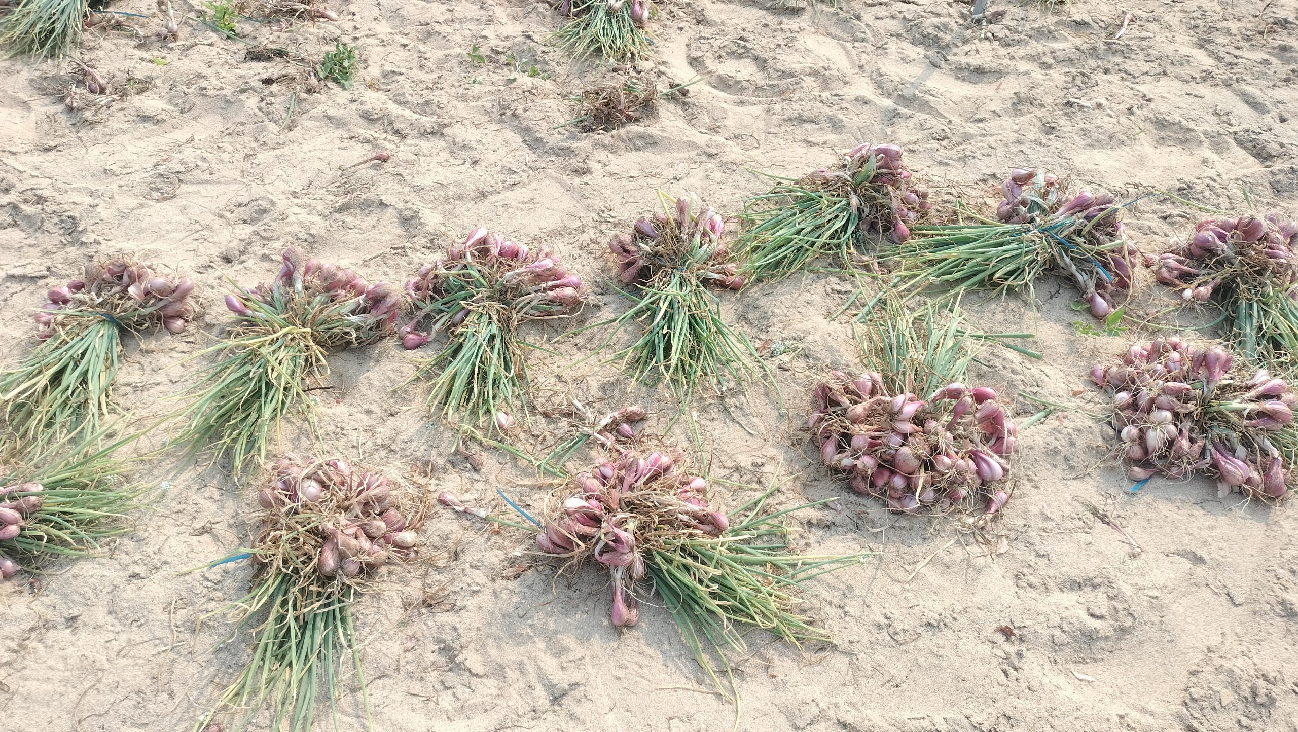Trong lúc chờ tiểu thương đến thu mua, sau khi thu hoạch người nông dân sẽ bó hành thành thành từng búi để treo. Việc này sẽ giúp tiết kiệm không gian, vừa giúp hành thông thoáng, nhanh khô hơn. |