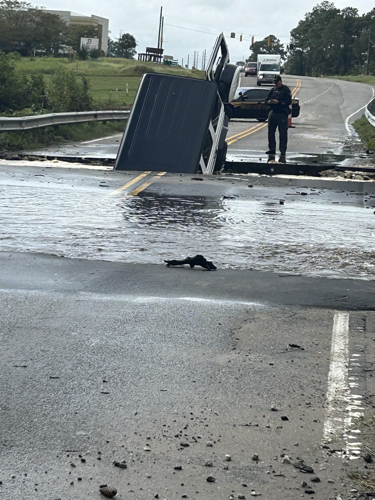 Tại cộng đồng Supply thuộc Quận Brunswick, anh Timothy Turner đã sử dụng ván lướt sóng để di chuyển sau khi con đường bên cạnh nhà anh bị phá hủy do lũ lụt. Ở một số khu vực, nước dâng cao hơn đầu anh.