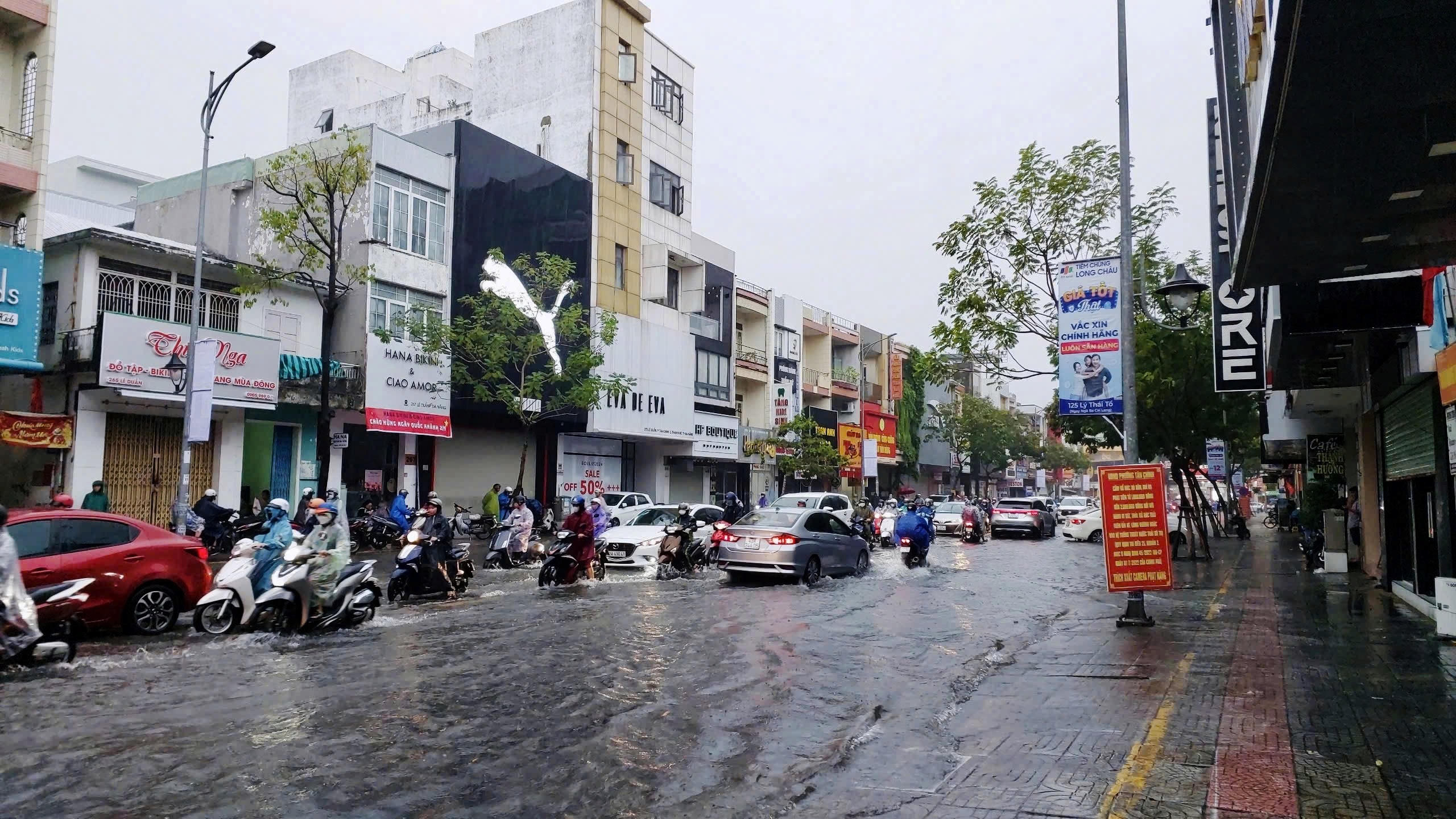 Nhiều tuyến phố tại Đà Nẵng ngập sâu từ 30 -40mm, ùn tắc cục bộ do mưa lớn vào sáng 18/9. |