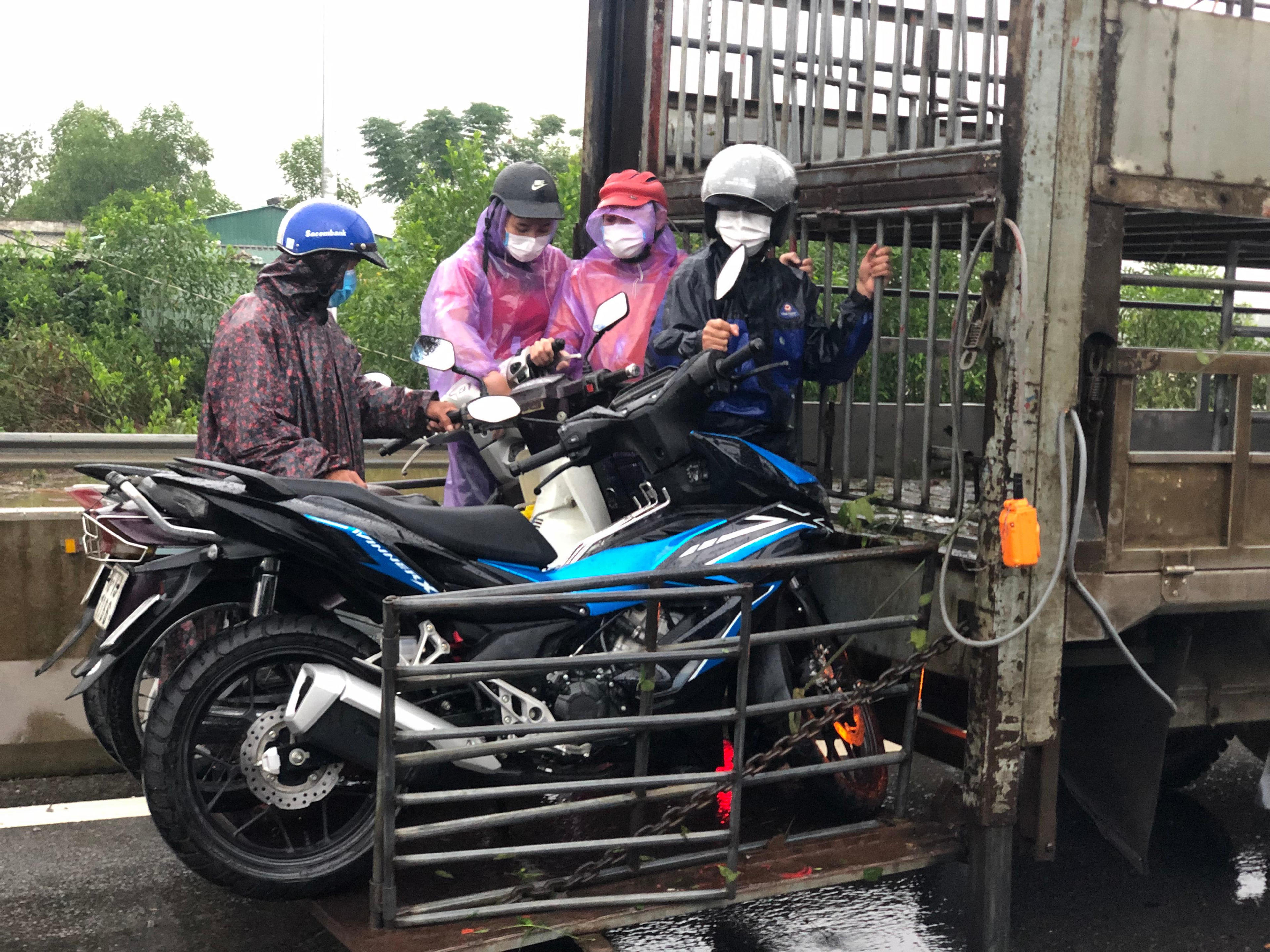 Nhiều người đi xe máy không qua được phải dùng xe tải để vận chuyển người và phương tiện đi qua đoạn nước chảy siết. |