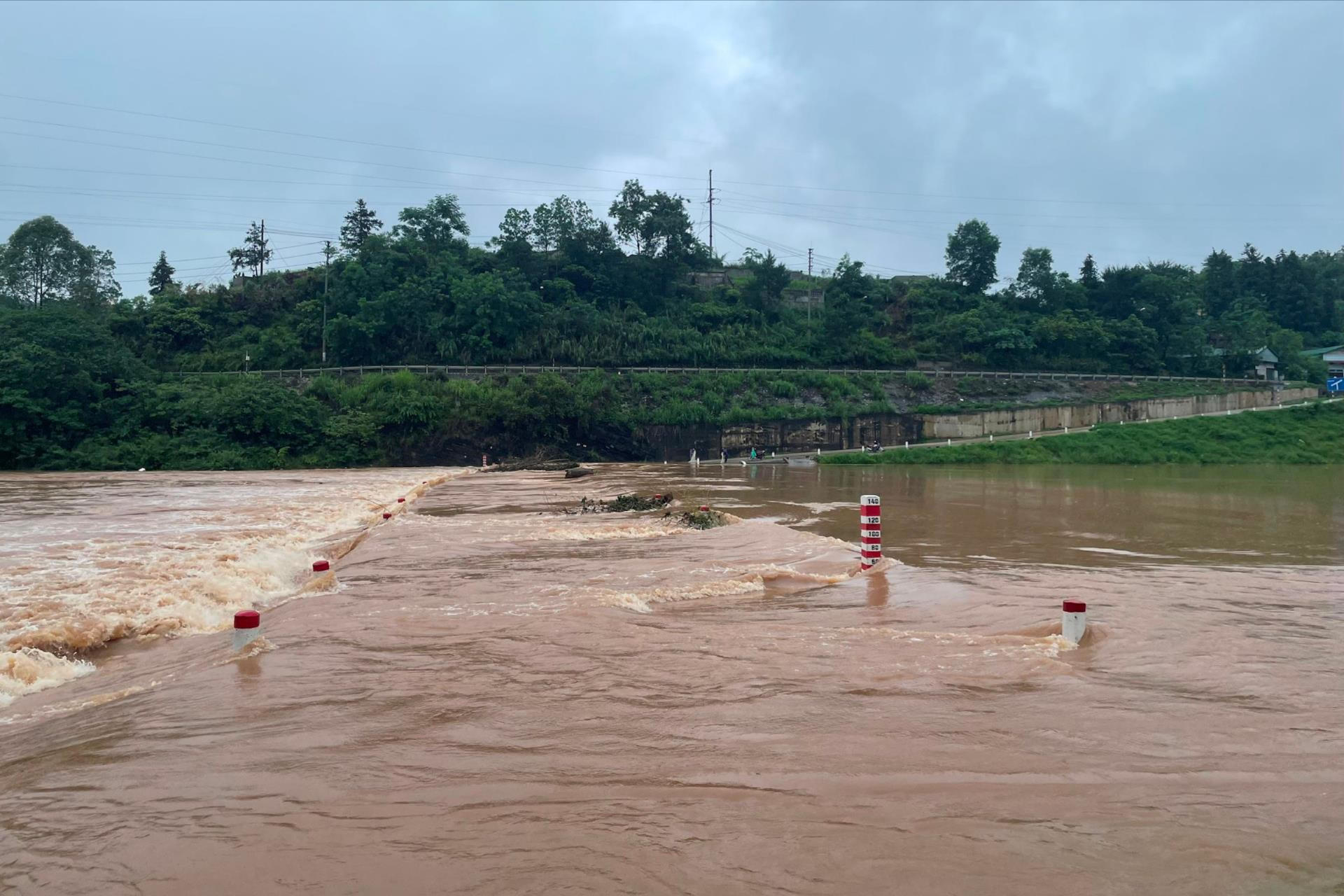 Lượng mưa lớn khiến khu vực ngầm Thác Trà, con đường nối giữa phường Tam Thanh và phường Chi Lăng ngập nặng, nước chảy xiết. Ảnh: Báo Công lý |