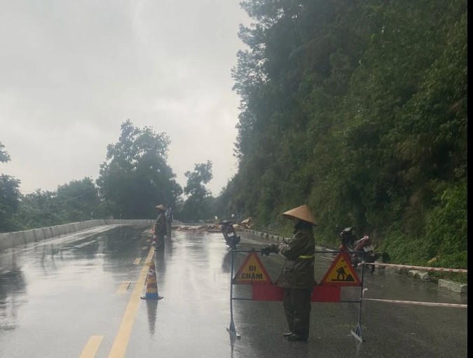 Mưa lớn khiến lượng lớn đất đá rơi xuống quốc lộ 8A, đoạn qua địa bàn huyện Hương Sơn. Ảnh: CTV |
