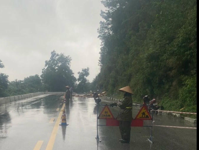 Mưa lớn khiến lượng lớn đất đá rơi xuống quốc lộ 8A, đoạn qua địa bàn huyện Hương Sơn. Ảnh: CTV