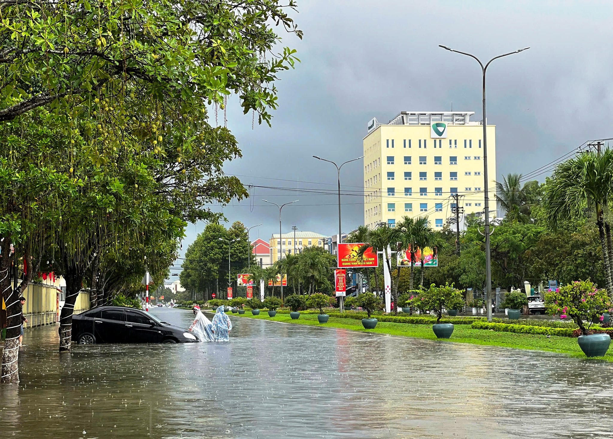 (PLVN) - Mưa lớn kéo dài từ đêm 20 đến sáng 21/10 khiến nhiều tuyến đường ở TP Tam Kỳ (Quảng Nam) ngập sâu trong nước. Người dân lưu thông khó khăn, nhiều phương tiện bị “chết máy”, trong đó có cả ô tô.