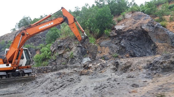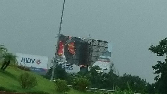 Gió to, mưa lớn khiến các biển quảng cáo hư hỏng nặng. Tại khu vực gần km30 đường tỉnh 328 Cẩm Phả máy xúc và xe tải đã được huy động cào đất tránh đất sạt nở trôi xuống gây ách tắc giao thông.
