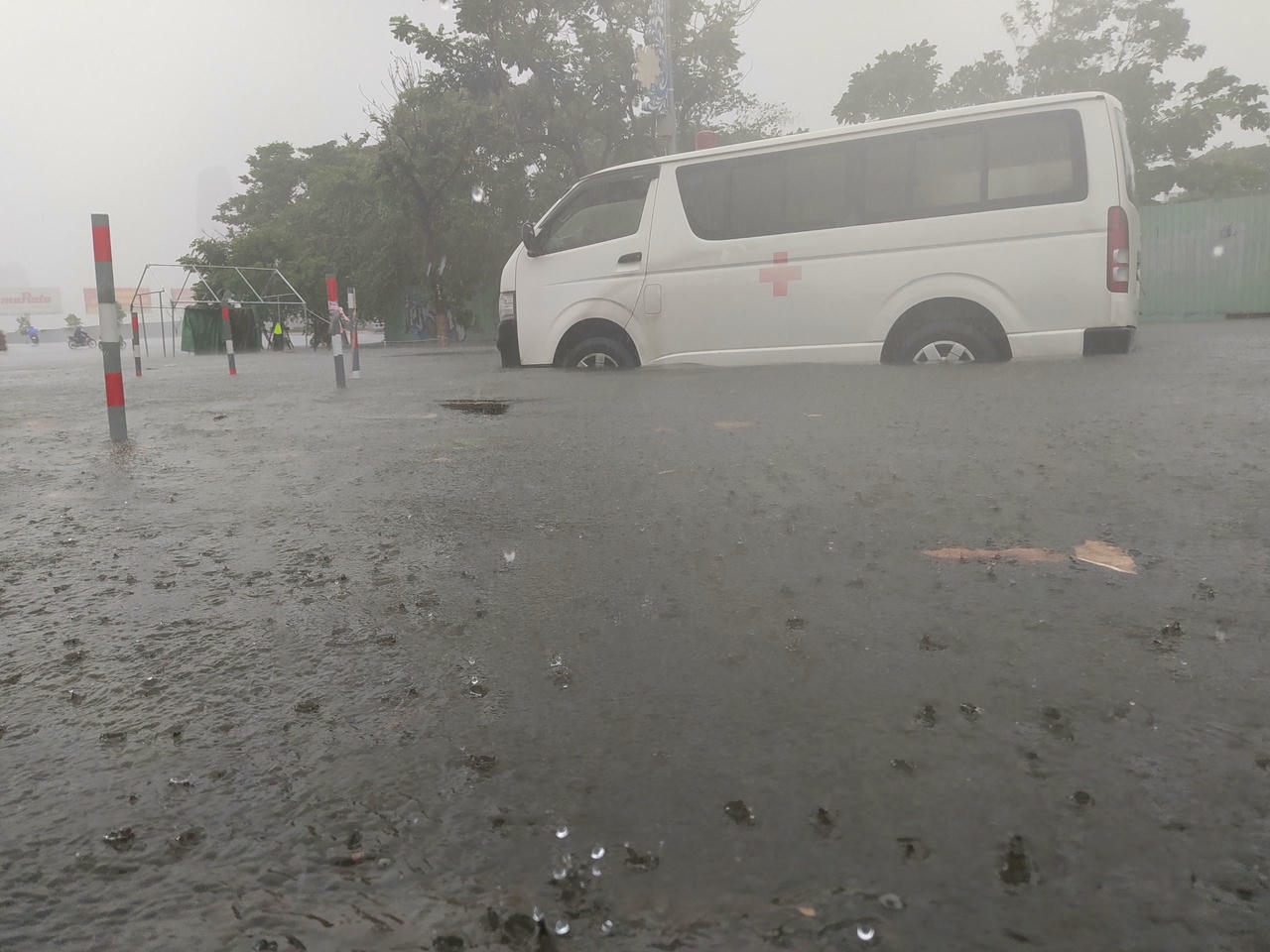 Mưa "trắng trời" trước bão, đường phố Đà Nẵng ngập nặng, xe cứu thương và nhiều phương tiện chết máy