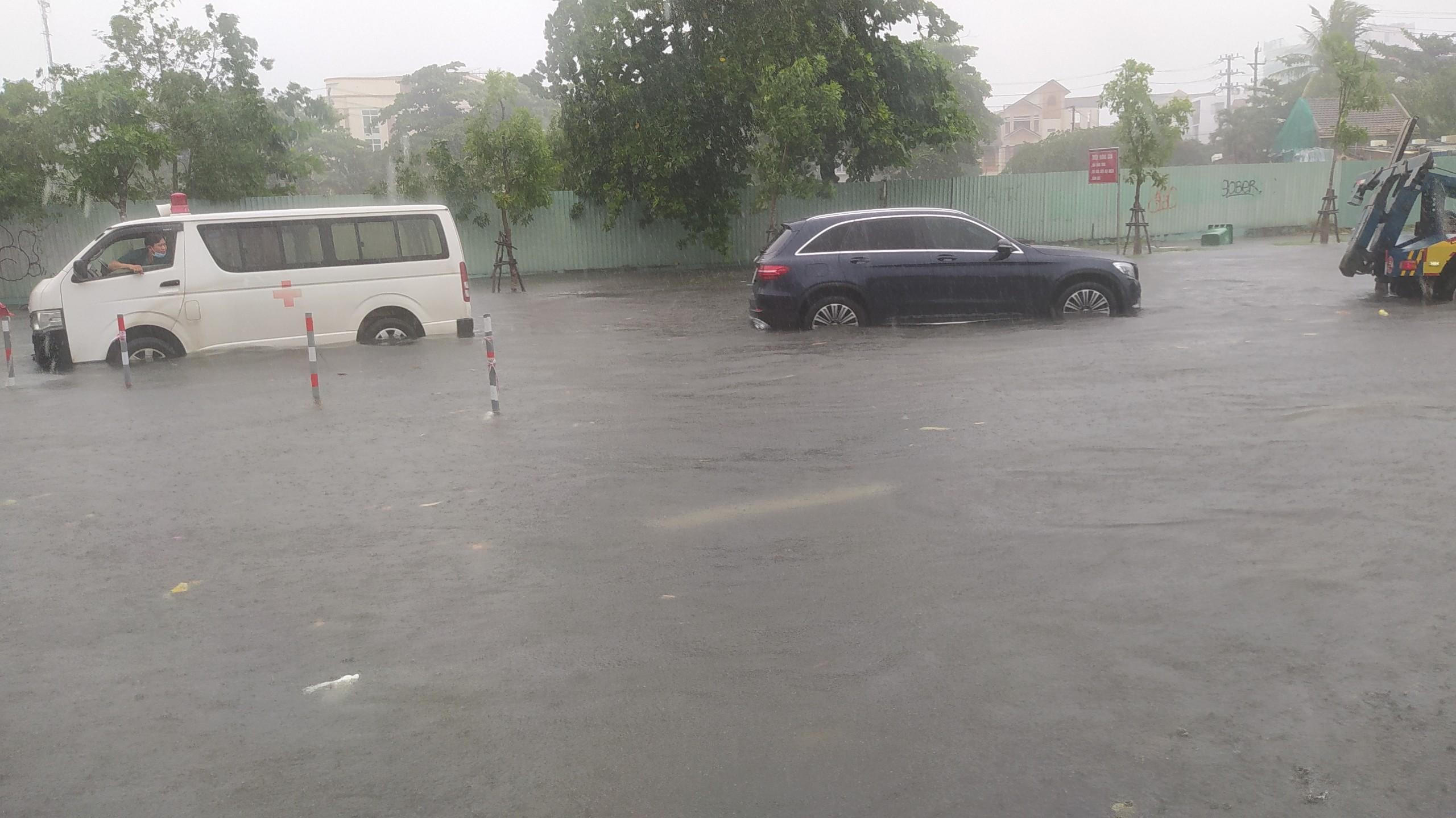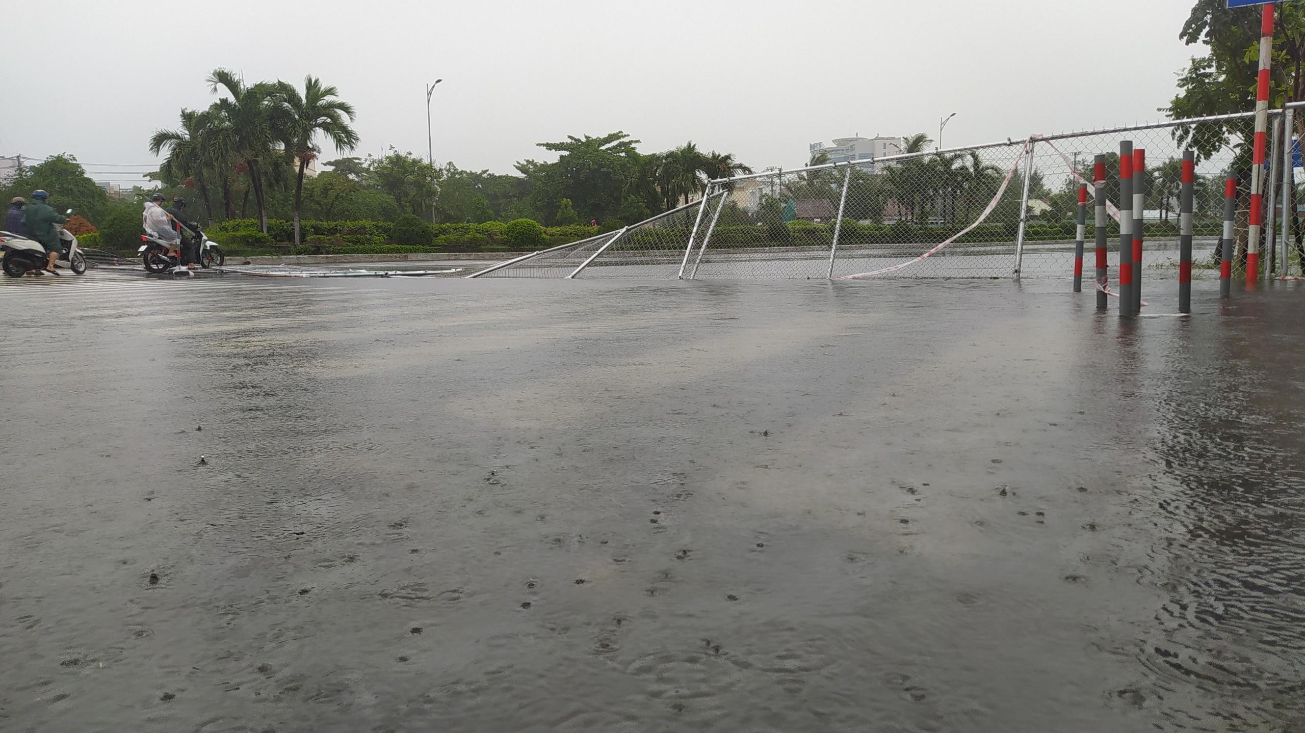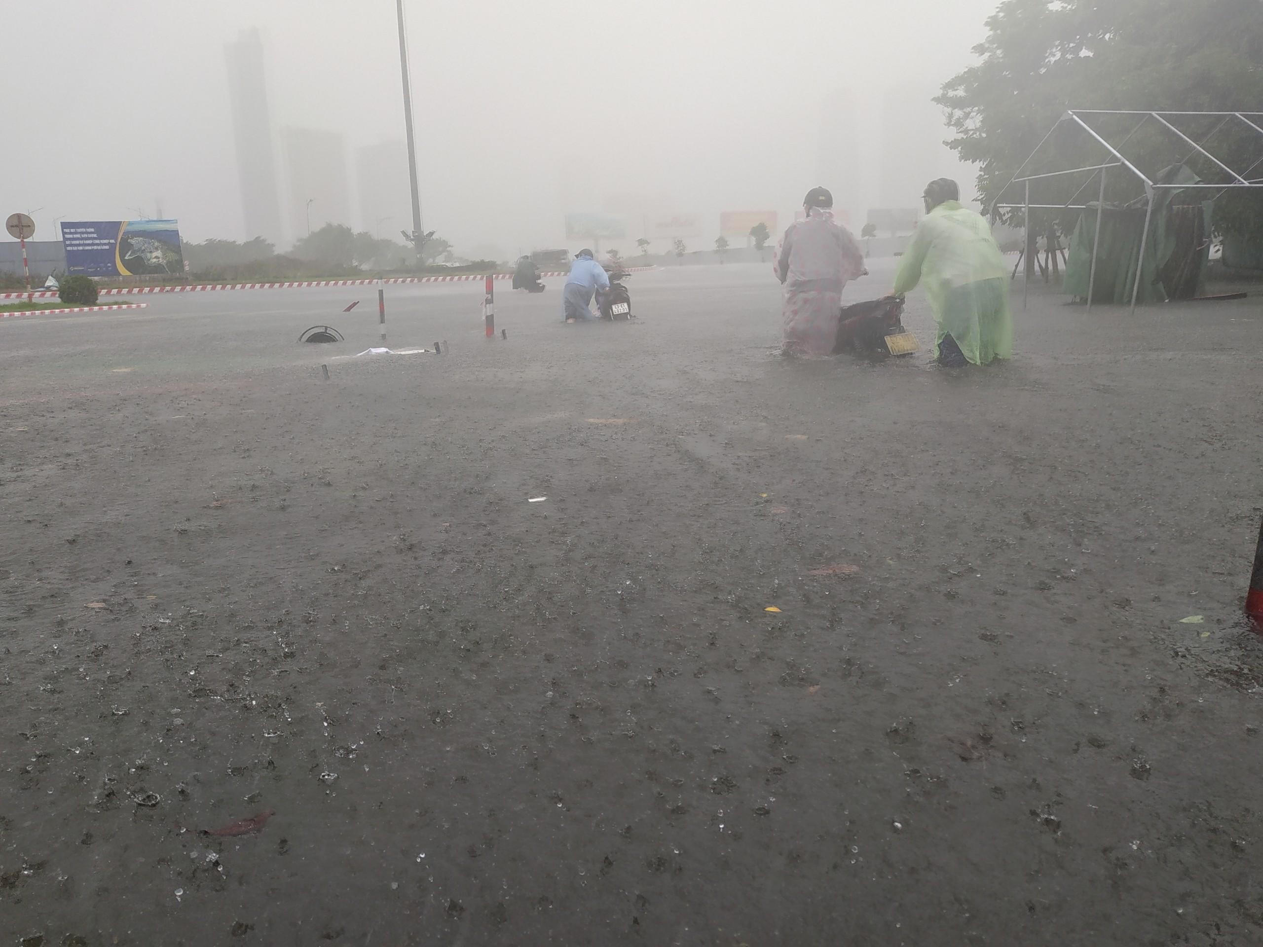 Tại đường Phạm Văn Đồng, mưa cũng khiến tuyến đường lớn này bị ngập sâu đến đầu gối. Nhiều vật dụng như bàn ghế nhựa, dù che tại chốt kiểm soát dịch tại đây cũng bị gió và nước cuối trôi lềnh bềnh