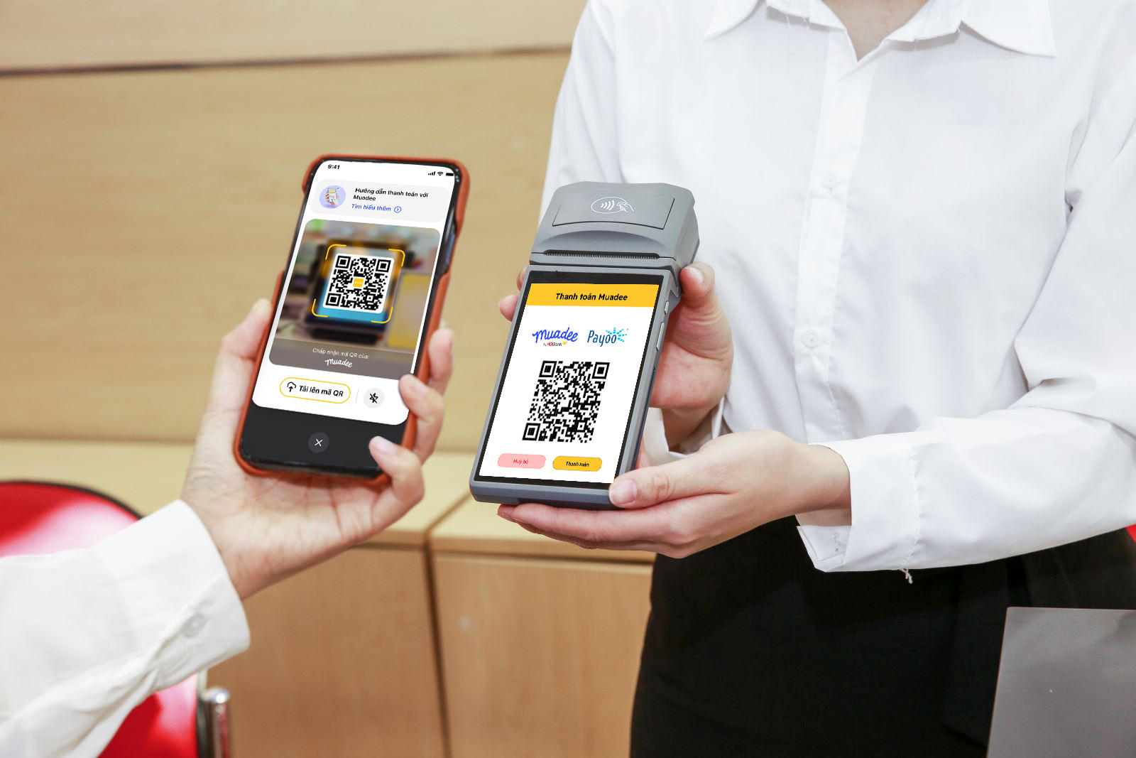 Tận hưởng cuộc sống và quản lý chi tiêu hiệu quả, khách hàng có thể dùng Muadee by HDBank để thanh toán tại các cửa hàng có sử dụng máy Payoo POS. Mở ứng dụng Muadee by HDBank trên điện thoại và quét QR Code hiện trên Payoo POS.