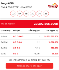 Cụ thể, kỳ quay tối ngày 9/6/2021 của xổ số tự chọn Mega 6/45 đã xác định có một vé trúng giải cao nhất là Jackpot với trị giá giải thưởng gần 29,293 tỷ đồng. Đây là lần thứ 2 liên tiếp chỉ trong 1 tháng, nhà mạng MobiFone có thuê bao trúng Jackpot khi mua vé qua kênh điện thoại Vietlott SMS, kể từ lần đầu tiên Jackpot "nổ" vào ngày 18/5/2021.
