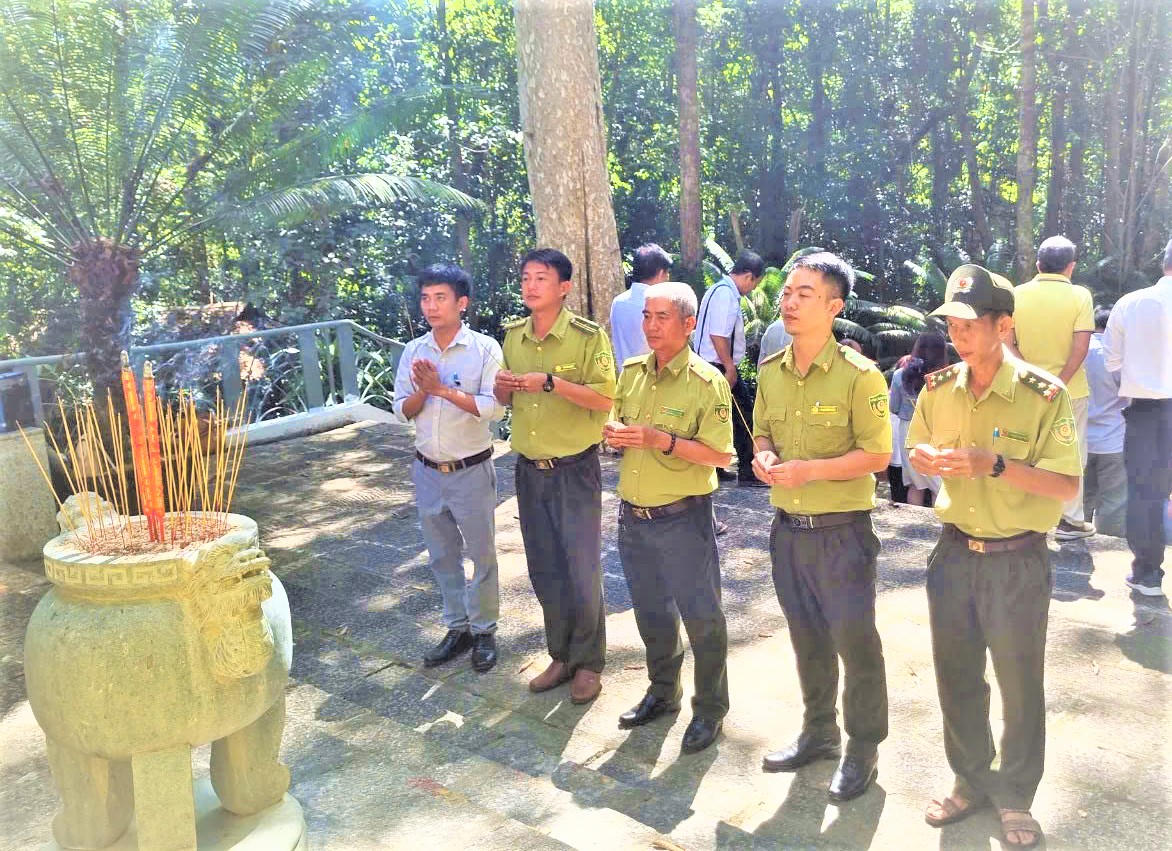 Các chiến sỹ kiểm lâm Khu bảo tồn thiên nhiên - văn hoá Đồng Nai thắp nhang tưởng niệm các anh hùng liệt sĩ tại di tích Trung ương Cục miền Nam |
