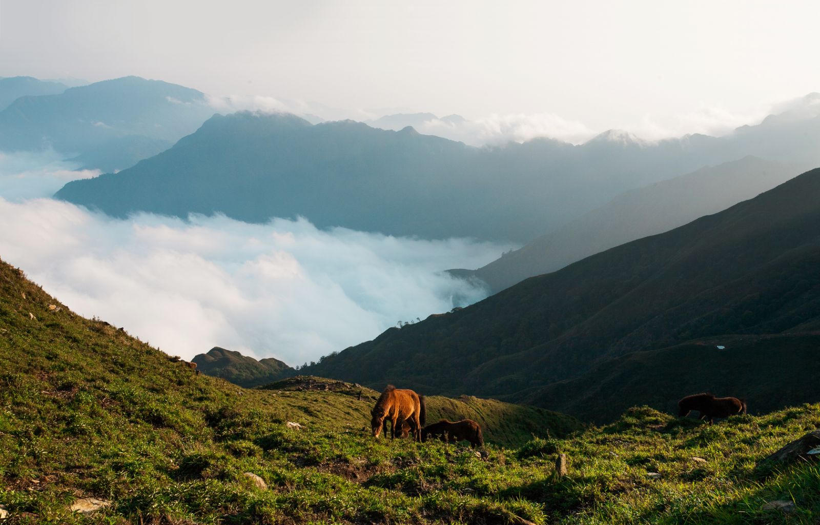 Cả đoàn leo núi nối đuôi nhau nhấc từng bước chân nặng trĩu, bỗng hiện ra cảnh tượng đàn ngựa hàng chục con đùa giỡn, chạy nhảy khắp sườn núi, nhởn nhơ gặm cỏ. Chốc chốc một vài con ngước lên nhìn đoàn khách đang cheo leo lưng chừng núi. Giữa trời xanh lộng gió mênh mông, ngỡ như lạc vào cuộc sống trên bình nguyên bao la người du mục.