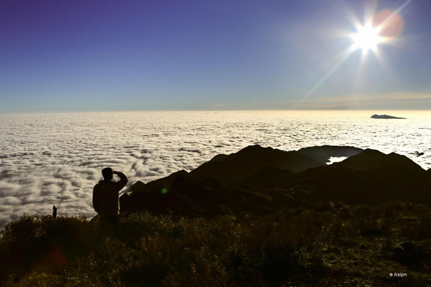 Sau một đêm ngủ trên ngọn núi cao gần 3000m, chúng tôi thức giấc với cảnh tượng kỳ thú trước mắt. Gió lồng lộng, phía chân trời đỏ ửng, “đại dương” mây bồng bềnh trắng bao quanh những ngọn núi xanh như những ốc đảo. Không gian hùng vĩ. Những vị khách chỉ biết ngẩn ngơ nhìn ngắm, rồi hét lên thật to để nghe tiếng mình vọng ra giữa nơi mặt đất và bầu trời giao thoa.