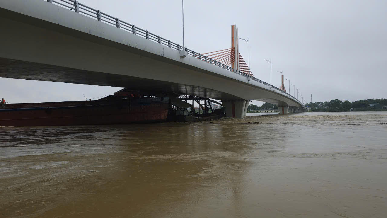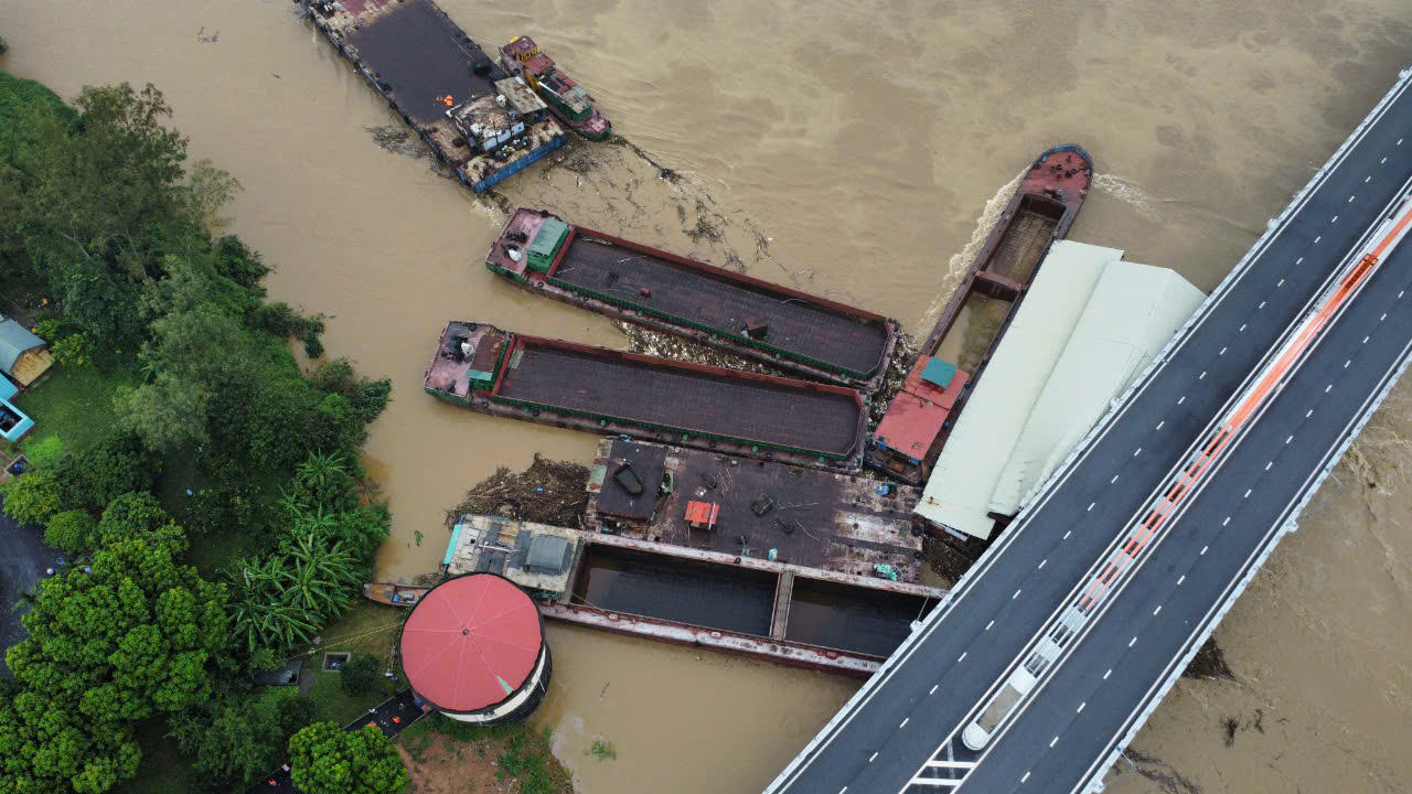 (PLVN) - Sáng ngày 10/9/2024, mực nước sông Lô vẫn tiếp tục dâng cao, dòng nước chảy xiết đã khiến nhiều phương tiện tàu, thuyền bị mắc kẹt vào chân cầu Vĩnh Phú.