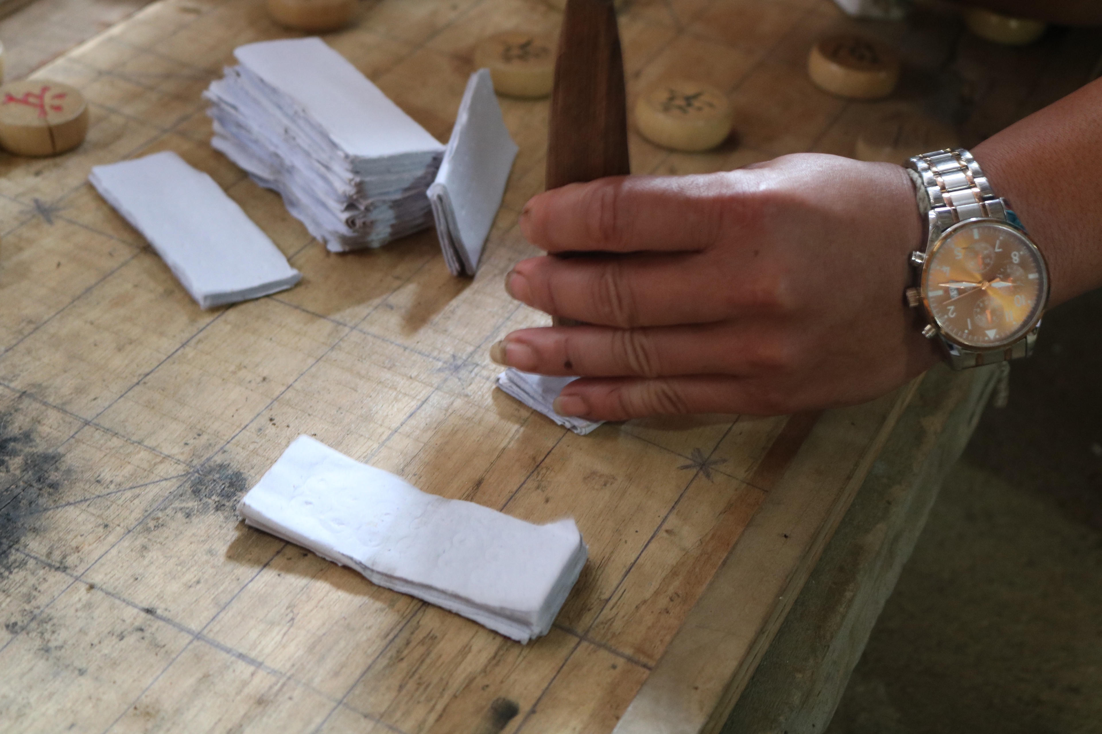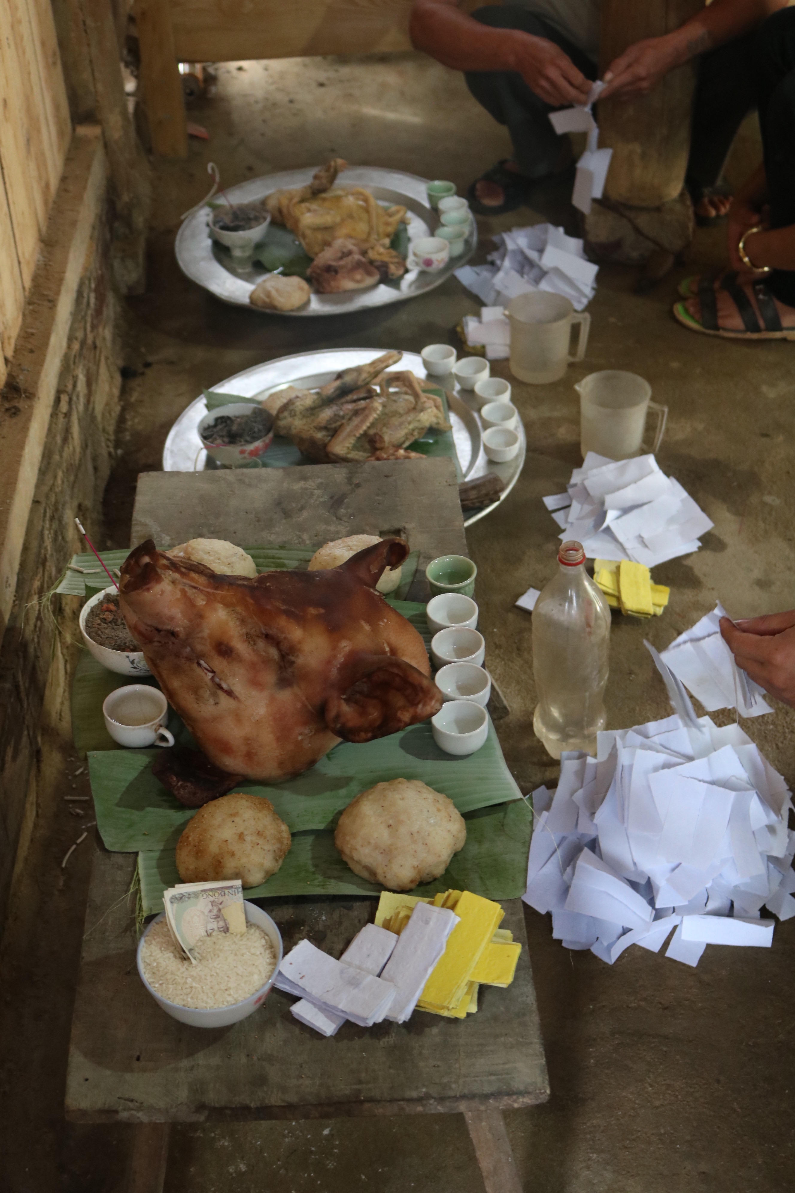 Sau đó, thầy cúng rót rượu và đếm tiền giấy cho tổ tiên. Tiền âm phủ này được đóng dấu hình tròn cho, được cho là "để tổ tiên cúng biếu người âm phủ và tiêu xài". Theo quan niệm người dân, mỗi ngôi mộ là một ngôi nhà, người âm có ba hồn bẩy vía thì ba hồn sẽ ở lại âm phủ trông coi nhà, bảy vía sẽ theo hương gạo về ăn tết cùng con cháu.