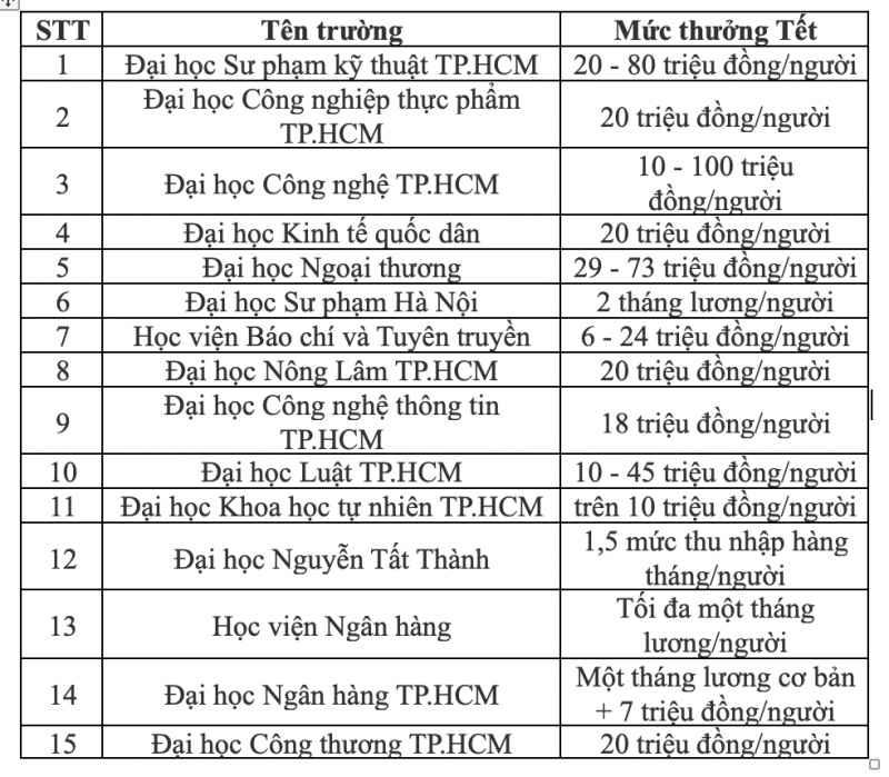 Mức thưởng Tết Nguyên đán 2023 của một số trường đại học. Ảnh: Báo Công thương |