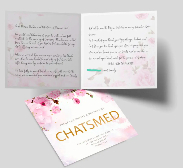 Ở một diễn biến khác, tại Nam Phi, vào khoảng tháng 3/2021, một chiến dịch độc đáo đã gửi tới hơn 20.000 tấm thiệp và thư viết tay tới các y, bác sĩ nước này đang nỗ lực chống lại COVID-19. Người khởi xướng chiến này là một phụ nữ tên là Benita Enoch, cũng là chủ sở hữu của Cardiology Cards – một dịch vụ tặng thiệp và quà tặng độc đáo ở Nam Phi. Cô đã bắt đầu chiến dịch “Healthcare Heroes Appreciation Drive” để tri ân và góp phần củng cố quyết của những người làm công tác tuyến đầu của đất nước.